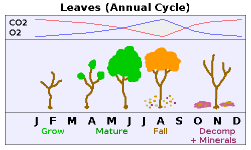 | The leaves are decomposed by bacteria using Oxygen to consume this Biomatter, returning to the air as much CO2 as the leaves took in. |